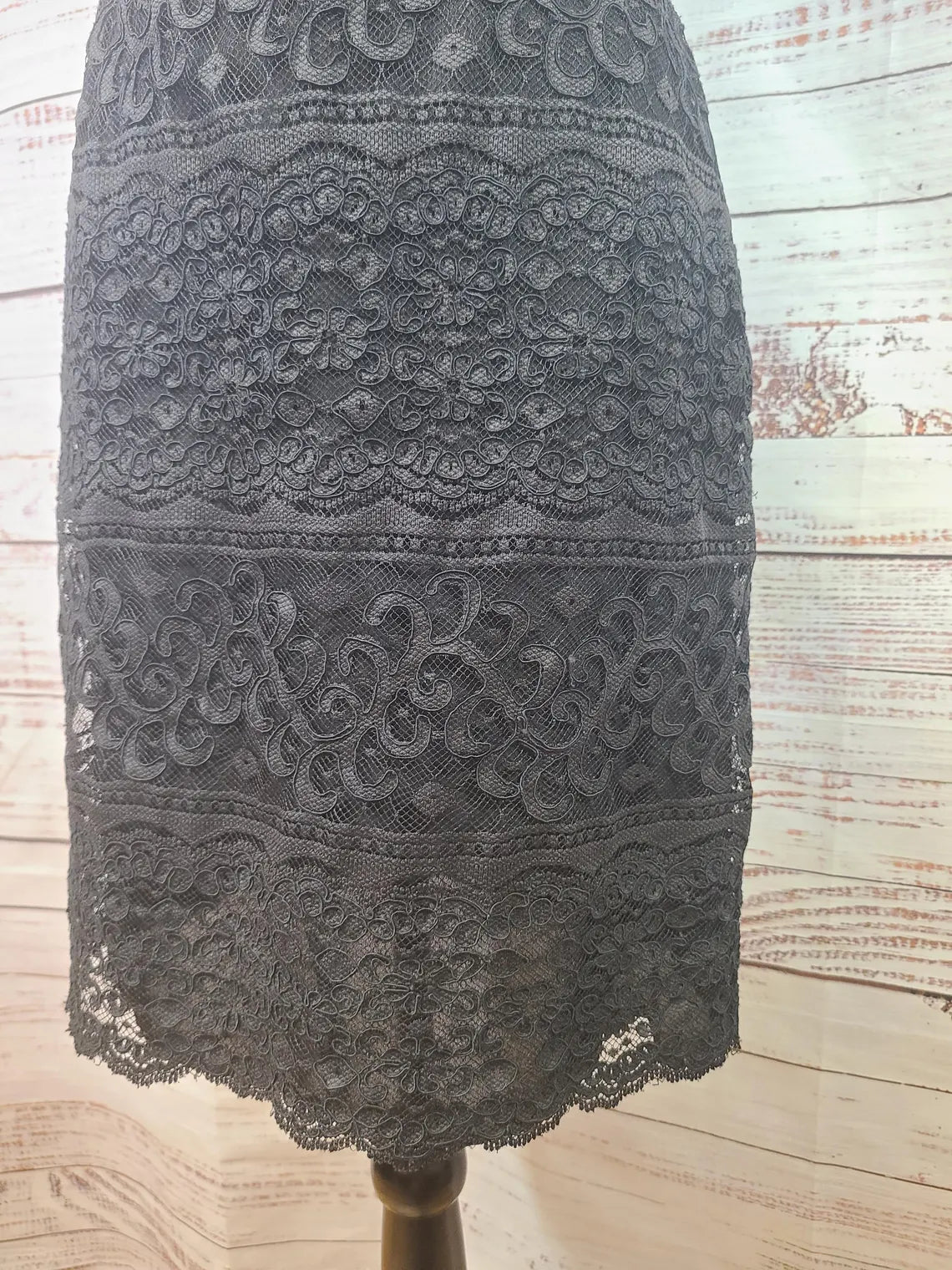 Up top: soft black jersey with a mock neck kissed with just the right amount of rhinestone sparkle (yes, only at the collar—because subtlety wins). Below: a beautifully textured black lace skirt that hits at the knee with a natural-to-drop waist vibe that flatters without fuss.