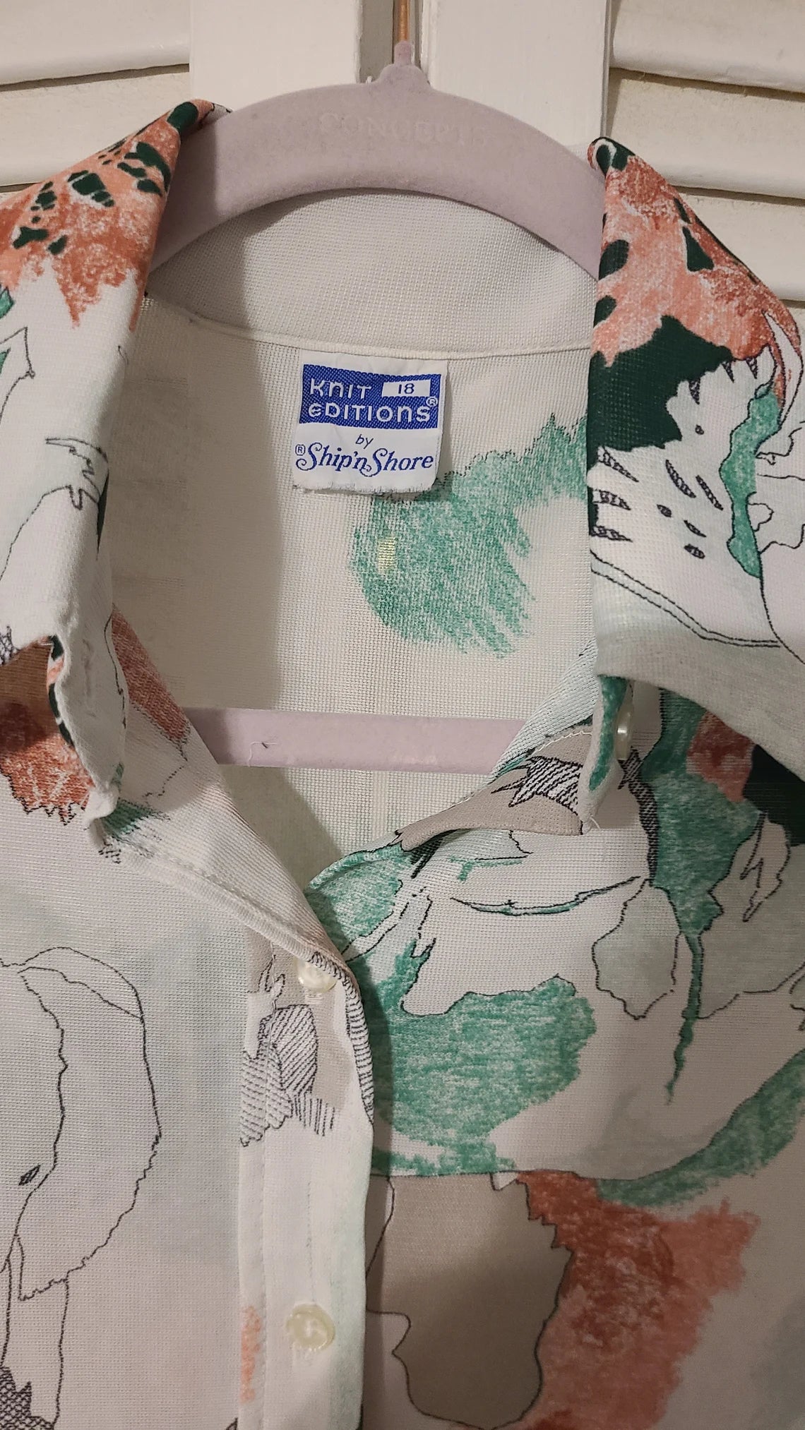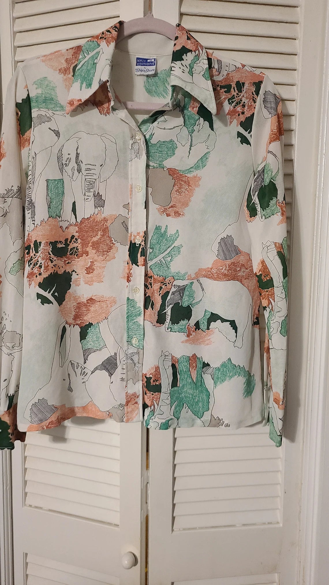 Extremely rare polyester knit 70s shirt. Perfect condition. Just a beautiful elephant print. Very soft and comfortable, almost sheer but not too see-through. Equivalent to size S/M.