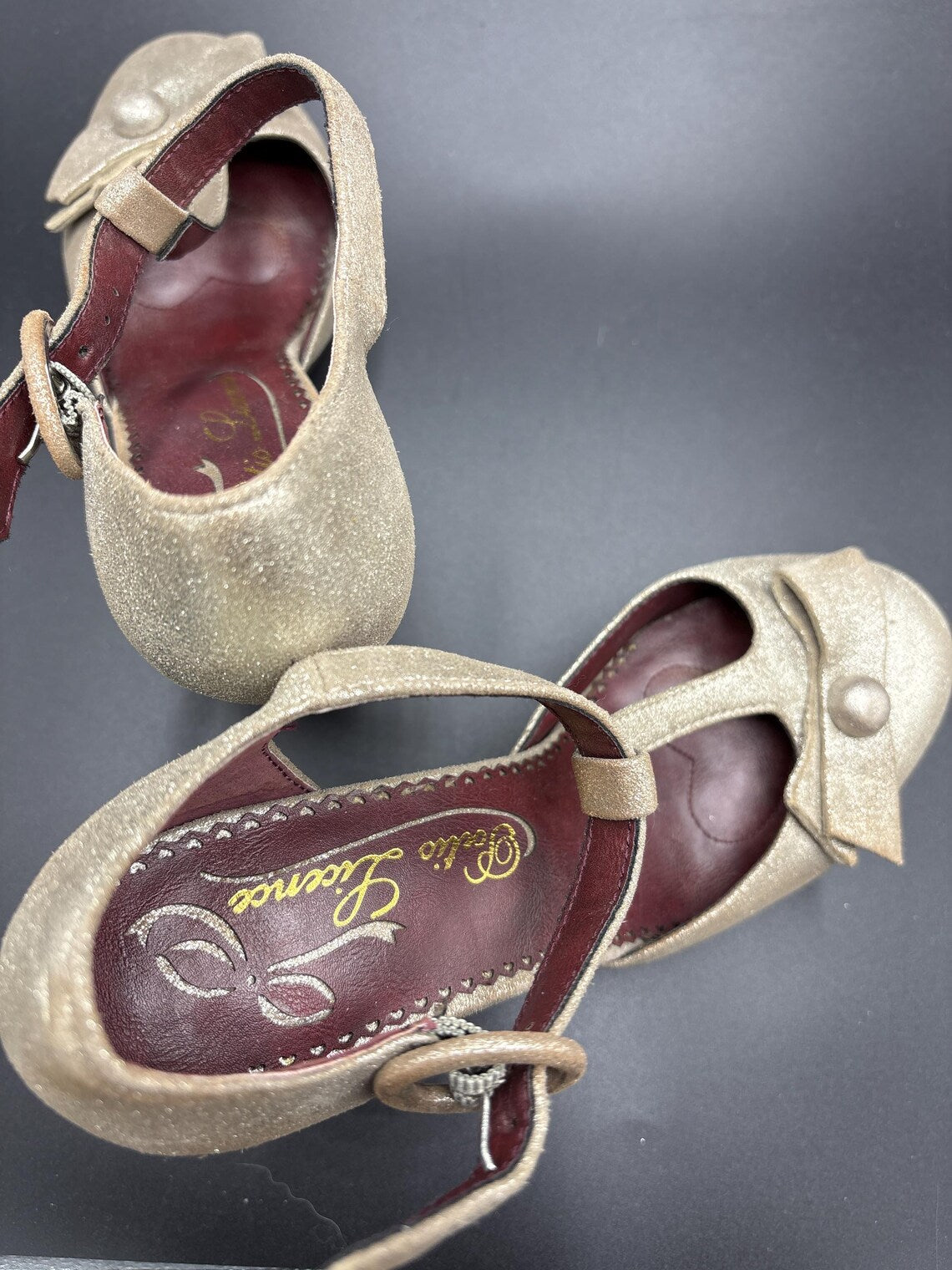 Golden hour in shoe form. These vintage poetio heels are soft gold suede with just the right shimmer- featuring a sparkly block heel, bold bow ath the toe, and delicate ankle strap with buckle closure. Closed toe keeps them classy, while the heel brings the party.