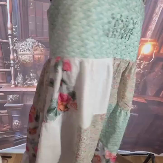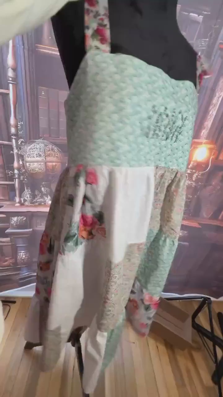 This dress is completely handmade from start to finish, built from panels of reclaimed cottons in soft florals, greens, and neutrals. The bodice is embroidered with a row of wildflowers stitched directly into the fabric, giving it a delicate detail that sets it apart. The skirt is pieced together from patchwork panels, each cut to flow into the next for a tiered drape. Shoulder straps are finished with floral ties, adjustable for fit and comfort.