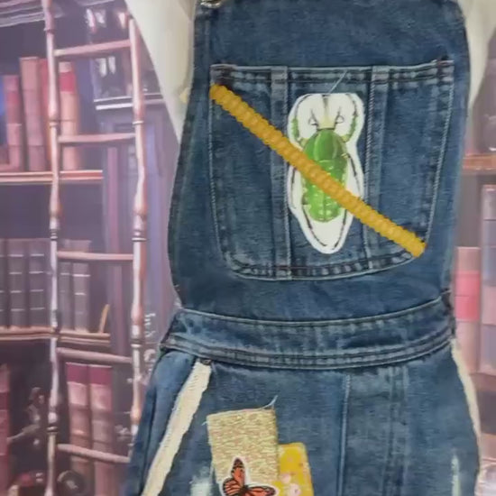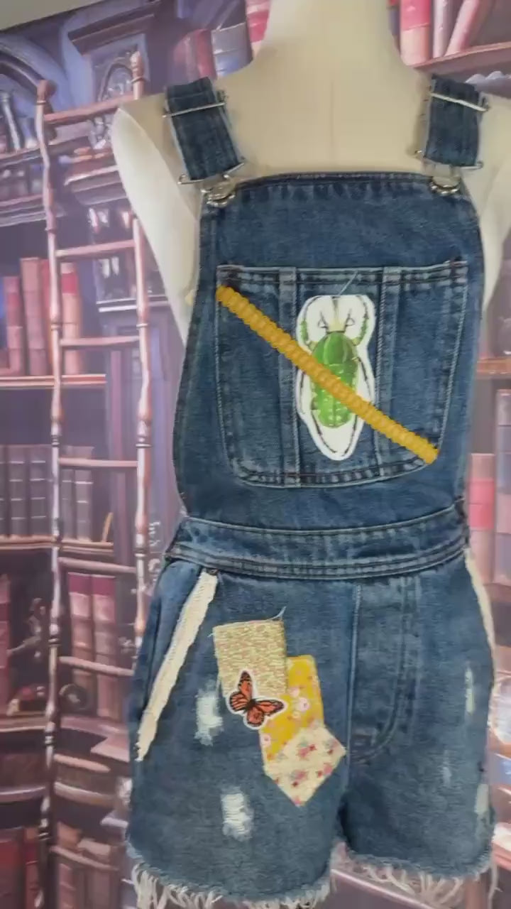 Upcycled Denim Overall Shorts with Embroidered Beetle and Patchwork Butterflies | Size XS