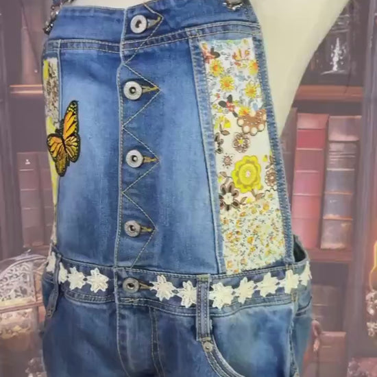Upcycled Denim Overalls with Butterfly Patches and Embroidered Bug | Size L