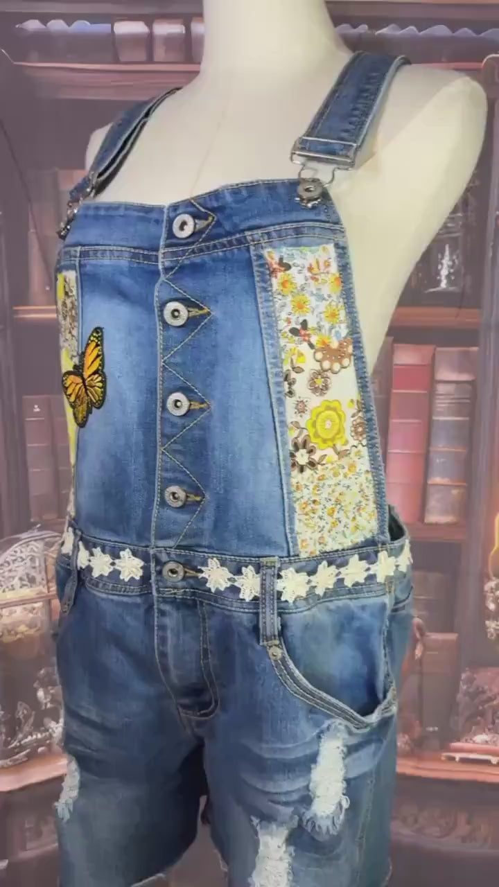 These denim overalls were reworked with playful details and colorful textures. The front bib carries patchwork panels of yellow gingham, sunflower florals, and vintage cotton prints. A butterfly appliqué rests on the front, adding movement and color against the denim. The back strap features a detailed embroidered bug stitched in green and black, giving the piece a bold accent.