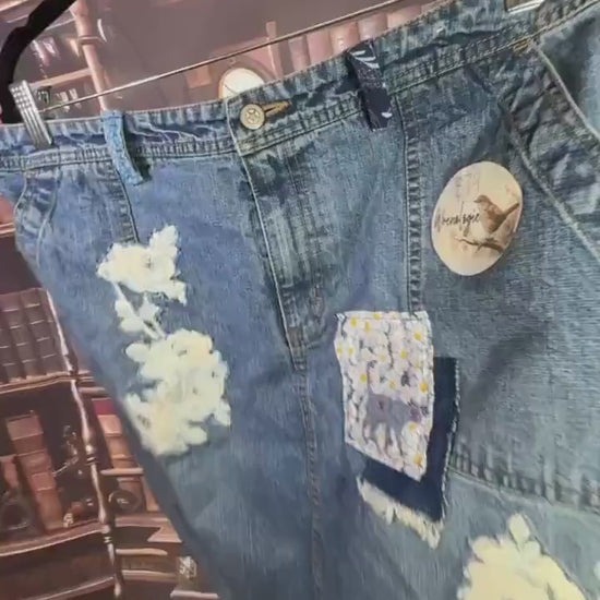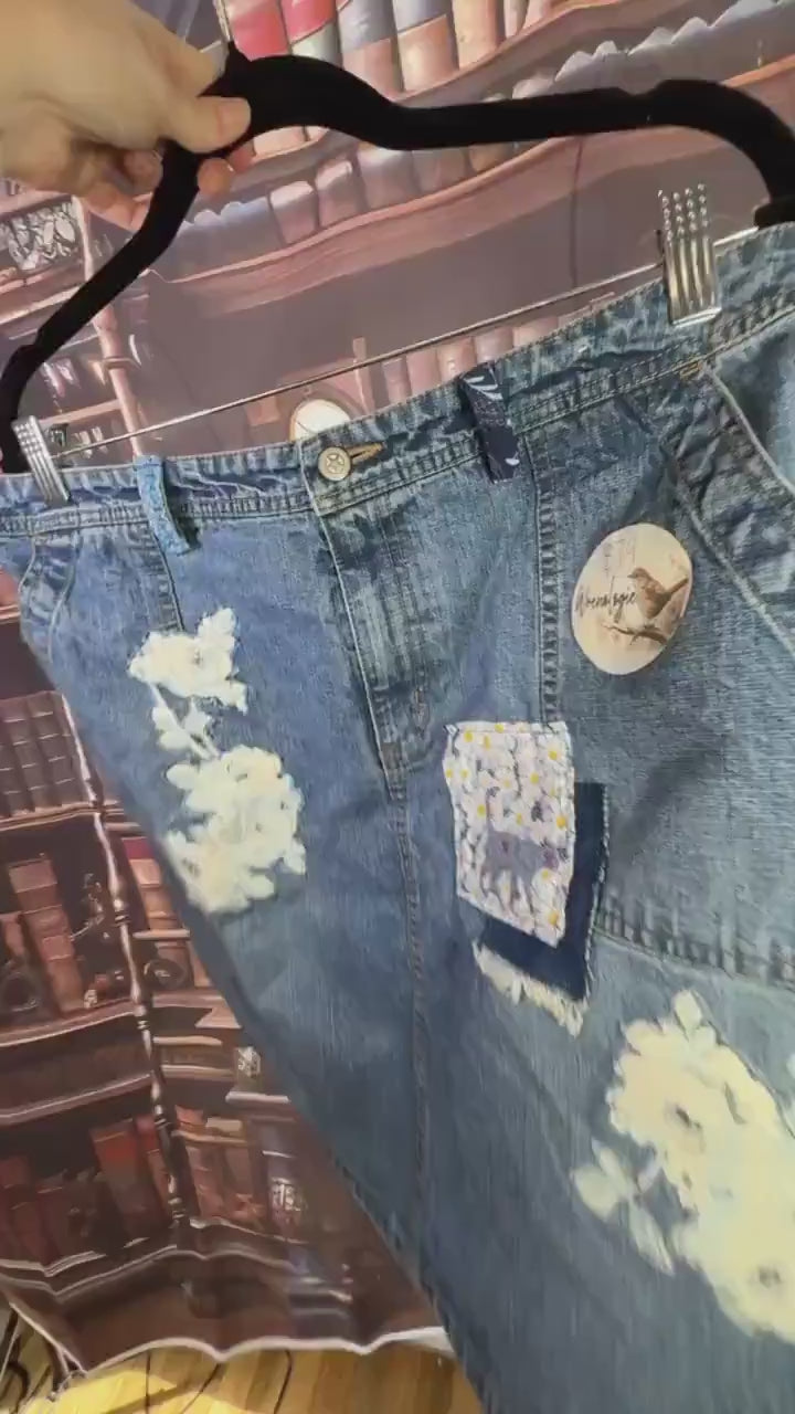 This denim skirt has been reworked with layers of floral appliqué and playful details that make it one of a kind. The front carries ivory rose appliqués stitched directly into the denim, paired with a daisy print patch framed by darker floral cotton. The mix of textures gives it depth while keeping the sturdy feel of the original denim.