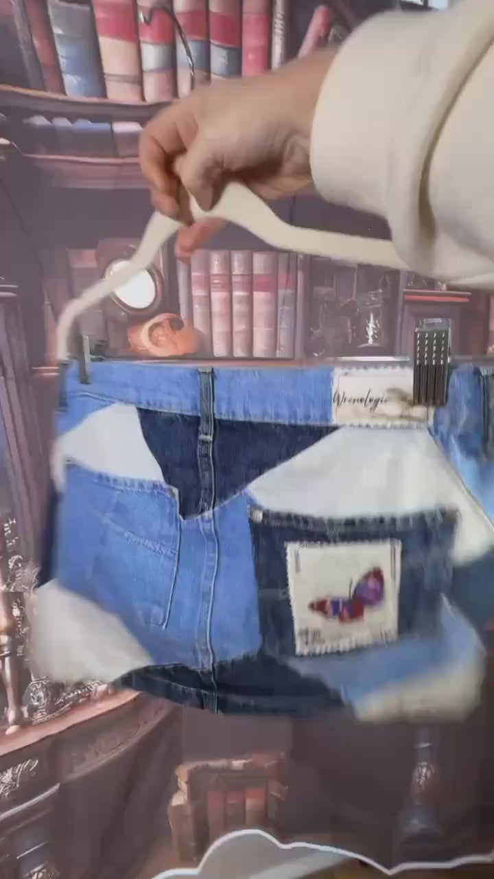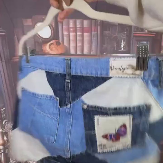 This size small skirt is stitched together from reclaimed denim in mixed washes, cut into bold diamonds and pieced into a patchwork layout. Along the seams, we worked in vintage ribbon trim each tiny rosebud giving the skirt a line of color and texture. On the front pocket, a vintage brooch and fabric stamp peek out like little treasures tucked away. The back carries a butterfly fabric stamp stitched onto the pocket, making the whole piece feel like a keepsake from another time. This skirt is always one of our show stoppers, but has yet to find its forever home!
