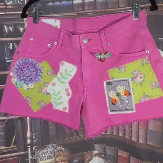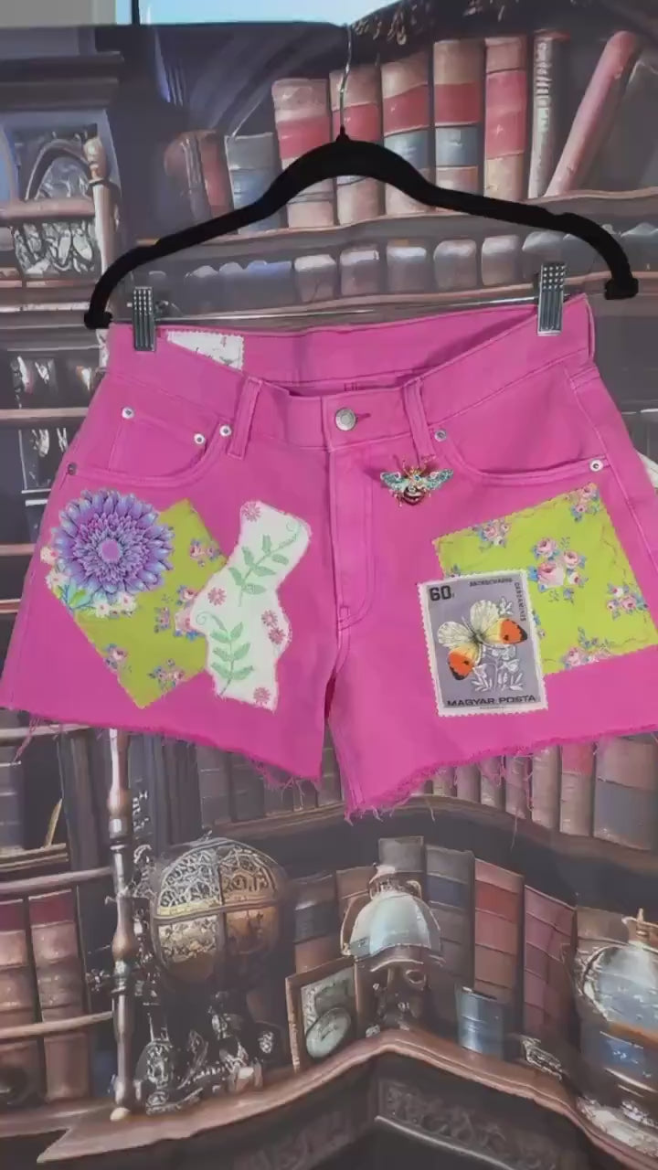 These bold size 4 pink denim shorts started as a simple base and became a canvas for fussy-cut florals and vintage textiles. Each patch is cut from reclaimed cloth, layered onto the shorts, and stitched down for durability. A vintage bee brooch rests above the pocket, catching the light just enough to give it a little shimmer. On the other side, a butterfly fabric stamp anchors the design like a tiny piece of mail from the past.
