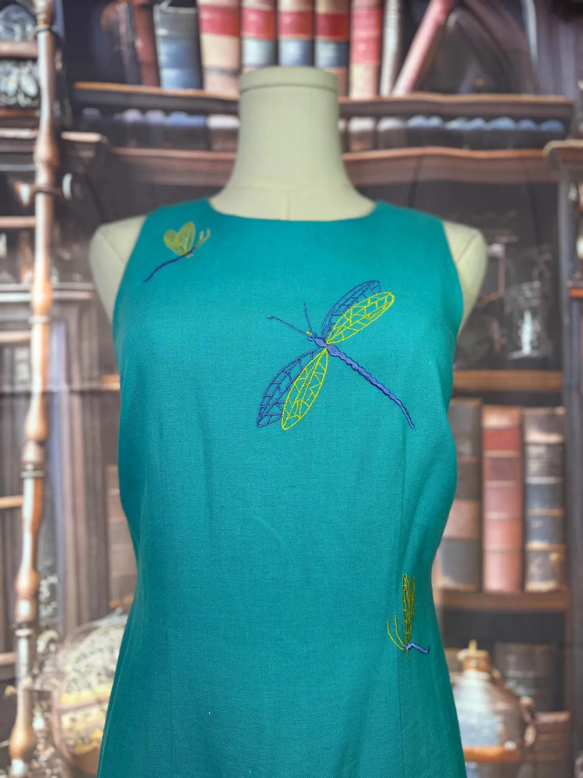 Sleeveless teal maxi with embroidered dragonfly details. Lightweight and airy with a straight silhouette. Unique vintage piece with whimsical embroidered accents.